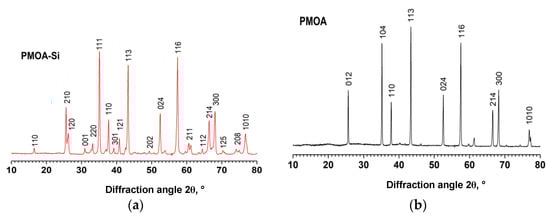 It is important to note that in the high temperature range ≥1000 °C, the chemical composition approaches ~Al2O3∙H2O∙x(SiO2), as shown in Figure 2, and the skeletal density of PMOA-M in this case is close to the corresponding orthorhombic AlOOH phases: 3.01 g∙cm−3 for boehmite and 3.44 g∙cm−3 for diaspore.