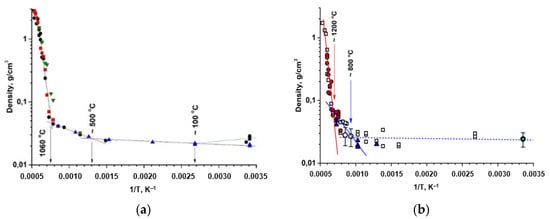 Evolution of the sample volume density as a function of the annealing temperature. The different markers indicated the different series of measurements. The characteristic transition temperatures are marked on the graphs: (a) PMOA samples: ~100 ÷ 500 °C—desorption and dehydration; 550 ÷ 1000 °C—the surface diffusion activation range; ≥1060 °C—sintering region [11]. (b) PMOA-M samples: ~150 ÷ 750 °C—desorption and dehydration; 750 ÷ 1150 °C—the surface diffusion activation range; ≥1200 °C—sintering region.