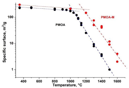 Raw PMOA samples modified with TMES after annealing at T ≥ 1000 °C possessed a specific surface area of ~204 m2/g, which is noticeably larger than that of the unmodified samples: ~170 m2/g. This difference increases at the annealing temperature up to 1300 °C, and the specific area ratio PMOA-M/PMOA increases by ~11 times. In contrast, the difference in the specific surface area begins to decrease at the annealing temperatures ≥ 1600 °C, which can be easily explained by an effective sintering process of both PMOA and PMOA-M materials (Figure 7).