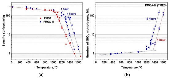 To estimate the number of monolayers on the PMOA-M surface depending on the treatment time in TMES vapors and annealing temperature, we used expression (13) and the specific surface area results of the PMOA and PMOA-M samples (Figure 7 and Figure 9a). The dependences obtained for describe well the experimental data presented in Figure 9b.