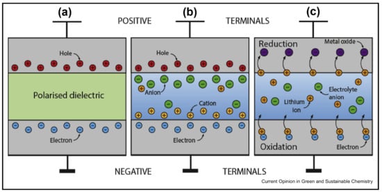 Schematic illustration of the differences in electrical charge storage mechanisms between (a) a dielectric capacitor with wide charge separation and polarised dielectric, (b) an EDLC with much closer charge separation partially provided by ions in the electrolyte, and (c) a Li ion-type redox battery with charge transfer occurring across the electrode-electrolyte interface. The thin upper line on each represents the positive terminal, while the thick lower line is the negative. Reprinted with permission from Ref. [5]. 2019, Elsevier.