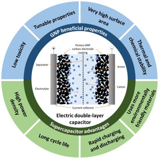 The most widely used supercapacitor electrode materials, particularly for EDLC devices, are high surface area carbon-based nanomaterials [2]. This is due to the many beneficial properties that this class of materials possess, from porous structure to corrosion resistance [12]. The carbon electrode material under analysis in this review will be graphene nanoplatelets, and the rationale behind the electrode material selection will be discussed in Section 2.3. A summary of the beneficial properties of GNPs that make them a suitable choice for a supercapacitor electrode material is described in Figure 2.