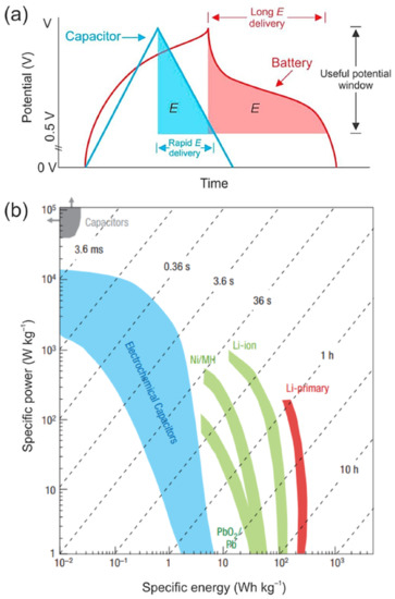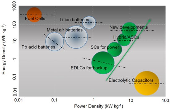 The properties of EDLC supercapacitors can be considered as lying partway between a conventional dielectric capacitor and a traditional battery. However, they possess a higher energy density than dielectric capacitors and a higher power density than LIBs, as illustrated in Figure 3 [7,8]. The first practical application of EDL capacitance was proposed in a patent granted to Becker in 1957 [9]. The patent detailed a “Low Voltage Electrolytic Capacitor” which stored energy by holding charges in a double layer at the interface between a porous carbon material and an aqueous electrolyte. Though the basic principles are still the same, supercapacitor design and performance has since been developed and improved considerably, with many different device types now available [3,7]. Currently, due to their high power density, supercapacitors are being utilised in many high-power areas including hoisting machinery, wind power generation and hybrid electric vehicles and racing cars, since the high power output allows for acceleration on a very short timescale [10]. In addition to the benefits for fast acceleration in electric vehicles, the high capacitance provides advantages for regenerative braking; supercapacitors are able to recapture kinetic energy through regenerative braking at least 20% more efficiently than batteries [4,11]. However, a goal for future energy storage technology developments is to succeed in providing both high energy density and high power density simultaneously in a single system [2].