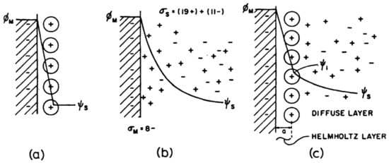 The changing model of the double layer: (a) Helmholtz model, (b) Gouy point-charge model, (c) Stern model for finite ion size with thermal distribution, combining the Helmholtz and Gouy models. Reprinted with permission from Ref. [3]. 1999, Springer.