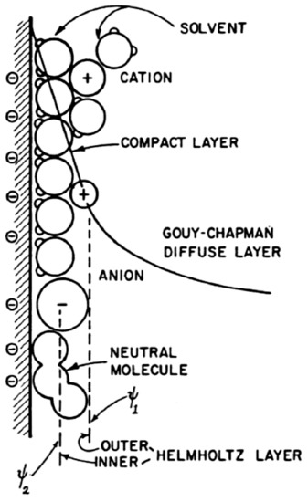The Grahame model of the double layer, showing different regions for adsorption of smaller, more-hydrated cations and larger, less-hydrated anions. Reprinted with permission from Ref. [3]. 1999, Springer.