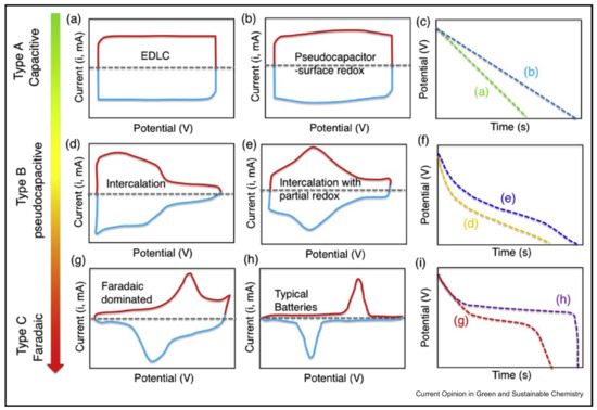 Schematic CV traces for different energy storage materials and their respective galvanostatic discharge curves. Each galvanostatic discharge curve is labelled with the letter of the corresponding CV trace. (a–c) Type A materials are distinctly capacitive, which includes EDLCs; (d–f) Type B are pseudocapacitive materials which are diffusion and/or intercalation limited; (g–i) Type C materials show a Faradaic battery-like response. Reprinted with permission from Ref. [4]. 2019, Elsevier.