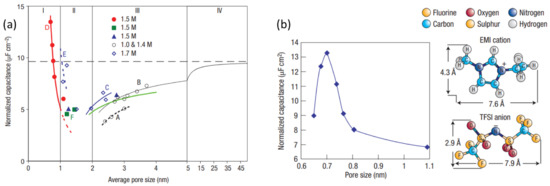 Further studies have supported this theory and concluded that maximum capacitance is obtained when the pore size is in the same range as the ion dimensions, which usually sits on the micropore scale [38]. CDC electrodes in a solvent-free electrolyte of [EMI, TFSI] ionic liquid at 60 C showed the best capacitance with samples with an average pore size of around 0.7 nm. As is shown in Figure 8b, both ions in the electrolyte also had maximum dimensions of around 0.7 nm, suggesting that a single ion per pore gives the highest capacitance [38]. The discovery that ion desolvation occurs in pores which are smaller than the solvated ions has led to large increases in specific capacitance for EDLCs, and has opened the door to designing high energy density devices [38].