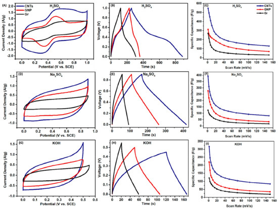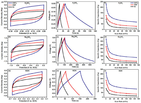 An in-depth study which compared commercial carbon materials in different electrolytes presented a road map for the proper selection of the carbon material for supercapacitor electrode use [21]. The road map was based on a systematic investigation of the behaviour of CNTs, GNPs and graphite in the most commonly used acidic, neutral and basic aqueous electrolytes (0.5 M , 0.5 M and 0.5 M ) using both computational and electrochemical tools. Various potential windows were used depending on the electrolyte, with both negative and positive potential windows explored. The results for both the positive and negative and negative potential windows can be seen in Figure 9 and Figure 10, respectively. The study concluded that the proper choice of carbon material with the complementary electrolyte and potential window can be used to design more efficient electrode materials for energy storage [21].