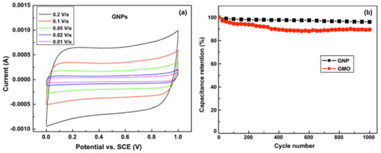 (a) Cyclic voltammetry results of GNPs at various scan rates in 2 M KCl aqueous electrolyte, and (b) Variation of the specific capacitance of GNP and GMO (-GNP) from cyclic voltammetry at scan rate of 400 mV/s in 2 M KCl aqueous electrolyte. Adapted with permission from Ref. [52]. 2011, Elsevier.