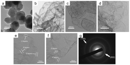 TEM images of (a) template, (b) SHS-4, (c) SHS-8, (d) SHS-10, HR-TEM graph of (e) SHS-8, (f) SHS-10, and (g) selected area diffraction (SAED) pattern of SHS-8. Samples labelled SHS-n according to the mass ratio of in the self-propagating high temperature combustion synthesis samples, which is 1:4, 1:8 and 1:10, respectively. Reprinted with permission from Ref. [58]. 2022, Elsevier.