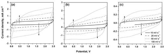 CV curves at various scan rates for the electrodes based on: (a) commercial GNP, (b) -GNP and (c) GNP exfoliated from graphite. The slight redox peak visible in (b) shows the very limited pseudocapacitance that was achieved with the -functionalised GNPs. Reprinted with permission from Ref. [51]. 2015, Elsevier.