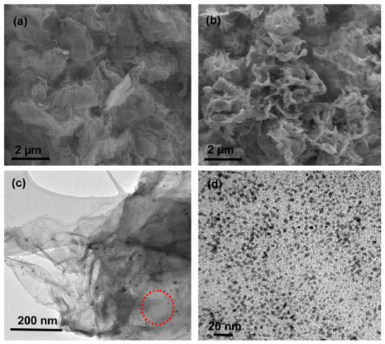 (a) SEM image of GNPs before incorporated with MnO2; (b) SEM image of -GNP composite; (c) TEM image of -GNP composite at low magnification; (d) TEM image of the area highlighted by the dashed cycle in (c) at high magnification. Reprinted with permission from Ref. [52]. 2011, Elsevier.