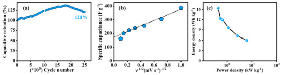 where and are relative permittivity of the electrolyte and vacuum permittivity, respectively, A is the effective contact area between the electrode and electrolyte and d is the thickness of the EDL [2,37]. As mentioned above, electrical energy storage devices are characterised using their electrochemical performance; most notably their energy and power density. In an ideal case with constant capacitance, a linear charge-discharge signature and a rectangular CV curve is achieved, as in Figure 6a–c. When this is true, the energy density W and the maximum power density can be expressed as