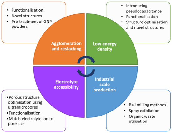 Within this review, the fundamentals of supercapacitor functionality will be discussed first and a brief description of pseudocapacitance will be given, before focusing on the EDL mechanism and EDLC devices. The problems pertaining to current supercapacitor technology will then be explored, alongside how such issues can be avoided through the choice of carbon nanomaterial and intelligent design of the porous structure. Current all-carbon based technologies being developed to overcome the drawbacks of traditional supercapacitor devices will be examined. Finally, the benefits and current research surrounding various functionalised GNP electrode materials will be reviewed. There are undoubtedly many facets to supercapacitor design beyond the electrode materials, from the binder and solvent used in the electrode ink [13,14,15,16,17,18,19] to the electrolyte choice [20,21,22,23,24,25,26], which can both have a considerable effect on the electrochemical performance of the device. Furthermore, many of the electrode materials to be discussed could also be candidates for battery technologies [27,28,29,30,31,32,33,34,35]. However, those topics are both beyond the scope of this review.