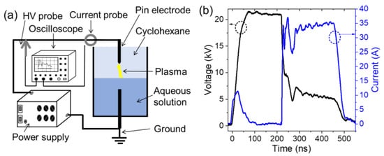 (a) Scheme of the experimental setup used to generate discharges in liquid cyclohexane that is in contact with a conductive solution. (b) Electrical characteristics (voltage and current) of a typical discharge in cyclohexane in contact with conductive solution (water + Co-nitrate + Ni-nitrate) generated at 22 kV voltage amplitude and 500 ns pulse width.