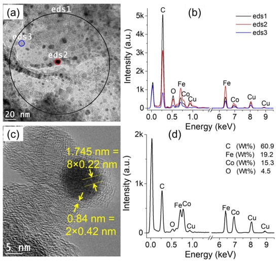 Figure 3 shows the characteristics of the particles produced in condition (ii), i.e., in a mixture of Co-nitrate and Fe-nitrate. Figure 3a shows the low-resolution TEM image of the produced particles. EDS analyses were performed on a large region (eds1) as well as on selected nanoparticles (eds2 and eds3). The three spectra are shown in Figure 3b, and all of them show the presence of Fe and Co, in addition to C, O, and Cu. The particles size distribution was performed on the imaged particles (not shown here) and shows that the majority of the particles are <10 nm. Figure 3c is high resolution TEM image that shows one nanoparticle as well as a film-like structure in which the particle is embedded. The average interplanar distance measured in the nanoparticle is ~0.22 nm, while the interplanar distance of the film around the particle is around 0.42 nm. Local EDS analysis performed on the particle shows the presence of Fe and Co, in addition to the other species (Figure 3d). Here, also, one concludes that discharges in cyclohexane in-contact with a solution of Co-nitrate and Fe-nitrate produce individual nanoalloys of Co-Fe embedded in carbon matrix.