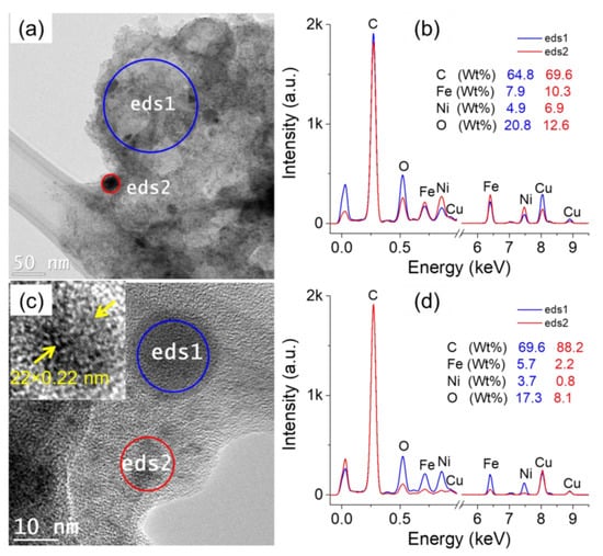TEM characterization of the particles generated by discharges in cyclohexane in contact with water + Fe-nitrate + Ni-nitrate collected from cyclohexane: (a) low-resolution TEM image, (b) EDS spectra acquired on the encircled zones in a), (c) high-resolution TEM image showing individual nanoparticles and the matrix around it, and (d) EDS analysis performed on the encircled zones in (c).