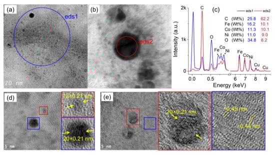 Finally, Figure 5 summarizes the observations performed on the particles synthesized in condition (iv), i.e., in a mixture of Ni-nitrate, Co-nitrate, and Fe-nitrate. TEM image (Figure 5a) shows that the majority of the particles are ultrasmall (<10 nm); it was also possible to find few large particles (50–100 nm), and a typical one is depicted in Figure 5b. EDS analysis performed on both particles’ population, the small as well as the large particles, shows the presence of Fe, Co, and Ni elements (Figure 5c), in addition to the other elements. Figure 5d,e show high-resolution TEM images of typical particles. The average interplanar distance measured on the particles is ~0.21 nm, and the measurement of the interplanar distance of the matrix is ~0.44–0.45 nm. These findings indicate, once again, that discharges in cyclohexane in-contact with a solution of Ni-nitrate, Co-nitrate, and Fe-nitrate produce nanoalloys of Ni-Fe-Co embedded in carbon matrix.