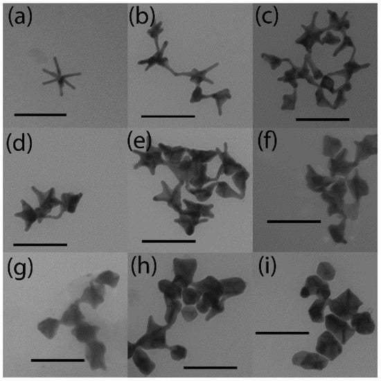 Analysis of TEM images in Figure 2 explains this spectral behaviour. Figure 2a reports the image of a typical GNS. For the lower values of silver/ascorbic acid concentrations, the coating mainly involves the GNS cores, leaving branches partially uncovered. As silver and ascorbic acid content increases, the GNS branches are progressively coated by silver. From GNS@Ag300 sample (Figure 2e) onward, branches of the majority of the original GNS appear almost completely covered, with a small portion of tips protruding from the silver envelops in a decreasing number of objects as the amount of silver increases. Indeed, for the higher investigated concentration of silver, sample GNS@Ag600, almost every object is completely enveloped by the silver shell and no tips are seen at all.