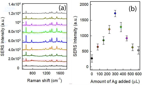 (a) SERS spectra of 10–5 M solution of R6G obtained in presence of colloidal suspensions of GNS (black line), GNS@Ag75 (red), GNS@Ag150 (dark green), GNS@Ag225 (orange) GNS@Ag300 (blue), GNS@Ag375 (green), GNS@Ag450 (pink), GNS@Ag525 (dark yellow), GNS@Ag600 (grey); (b) SERS intensity of mode at 610 cm−1 of R6G as a function of silver amount added to form the coating layer.