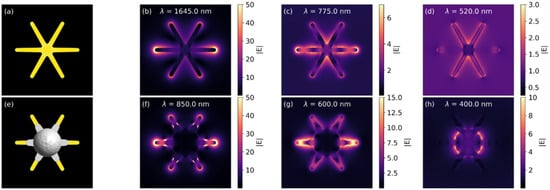 We may better understand the nature of the observed plasmonic resonances by examining the corresponding local field maps displayed in Figure 4. Focusing first on the pure GNS, Figure 4b immediately confirms the dipolar nature of the λ = 1645 nm feature, with strong field hot spots located at the star tips. The higher order nature of the λ = 775 nm peak is instead highlighted in Figure 4c, where additional field maxima are present along the GNS main axis. Finally, the much weaker core resonance is barely detectable in Figure 4d. We can draw similar conclusions for GNS@Ag by looking at the field enhancement maps of the Rshell = 30 nm structure as a representative example. Moreover, in this case we notice from Figure 4f that the main λ = 850 nm resonance is dipolar in nature, but now the dipolar hot spots are confined to the protruding portion of the gold nanostar arm. Similarly, the field enhancement map associated with the higher order peak at λ = 600 nm displays an additional central maximum and is confined to a single GNS@Ag arm, with the novelty that the field enhancement now spills over the silver covered portion of the star branch (Figure 4g). Additionally, in contrast with the pure GNS case, the silver spherical enclosure can instead support a strong dipolar resonance at λ = 400 nm, closely resembling that of a single, isolated silver sphere (Figure 4h).