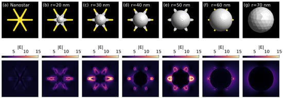 To fully understand this behaviour, we employed the boundary element method to model the experimental system as a six-branched gold nanostar surrounded by a silver shell of increasing thickness and immersed in water []. In our model, the silver spherical shell partially propagates along the arms of the gold star to better match the geometrical and compositional configuration emerging from the TEM images of Figure 2. The GNS geometry is characterized by an Rcore = 10 nm core radius, an Rstar = 65 nm external radius, a h = 8 nm thickness and a Rtip = 5 nm fingertip radius. The silver shell radius Rshell ranges from 20 nm to 70 nm, with a silver protrusion of length Ltip≃15 nm when present. In all the studied cases, the material’s optical properties are taken from the literature [,,], and the GNS@Ag target is illuminated with a plane wave normal to the nanostar equatorial plane and linearly polarized along the nanostar main axis.