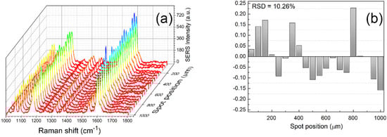 (a) SERS spectra obtained during a 1 mm-length linear scan of GNS@Ag300 chips coated with MMC; (b) relative RSD values obtained using the integrated intensities of mode at 1170 cm−1.