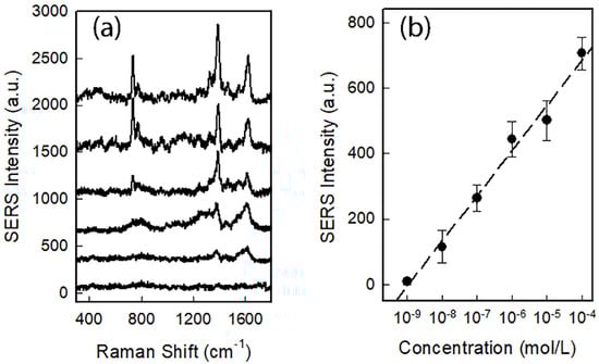 (a) SERS spectra of norfloxacin water solutions with concentration ranging from 10−9 (lower spectrum) to 10−4 M (upper spectrum) spotted on GNS@Ag300 SERS chips; (b) calibration curve obtained from mode at 1390 cm−1 (r2 = 0.987).