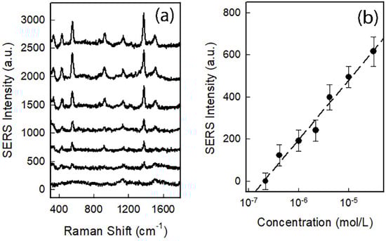 Thiram typical SERS spectra were observed, with two main modes at 550 and 1375 cm−1, as can be seen in Figure 9a. The pesticide is easily detectable for concentrations below 10−5 M following the SERS intensity of the mode at 1375 cm−1, with a limit of detection (LOD) which was estimated close to 0.4 µM, as can be seen in Figure 9b.