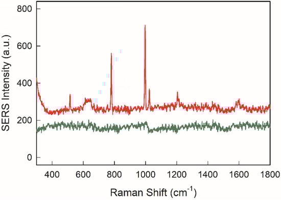 SERS spectra of a 5 mM solution of toluene in water spotted on 1% coated GNS@Ag SERS chip (red line), and on a GNS@Ag SERS chip (green line).