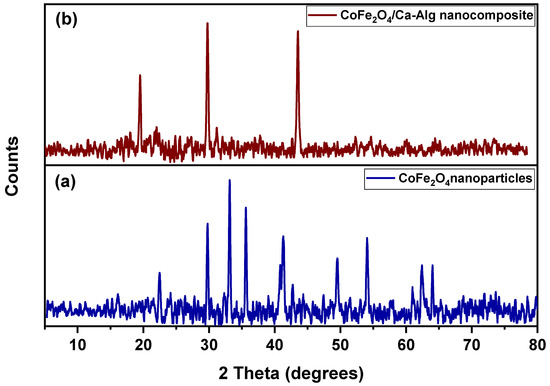 Figure 1a,b show the XRD patterns of green synthesized CoFe2O4 nanoparticles and the CoFe2O4/Ca-Alg nanocomposite, respectively. For CoFe2O4 nanoparticles, it could observe the reflection planes of (220), (311), (422), (511), (440), and (533) plans that correspond to the 2θ of 30.25°, 35.63, 53.75°, 57.28°, 62.91°, and 74.44°, respectively. These results confirm the successful green synthesis of CoFe2O4 nanoparticles, which is present in a face-centered cubic lattice structure. The high crystallinity of green synthesized CoFe2O4 was delivered in sharp and narrow diffraction peaks with good intensities [44,45]. In addition, some impurities peaks were displayed in the diffractogram, which may be attributed to the clove leaf extract compounds that coated the prepared CoFe2O4 nanoparticles during the synthesis process. For CoFe2O4/Ca-Alg nanocomposite, it could be observed the presence of a few peaks differ from that of the CoFe2O4 nanoparticles pattern and the disappearance of the featured peaks of CoFe2O4 nanoparticles. These results demonstrate the successful coating of CoFe2O4 nanoparticles by Ca-Alg biopolymer, and the observed peaks may be attributed to the small contributions that originated from the substrates.