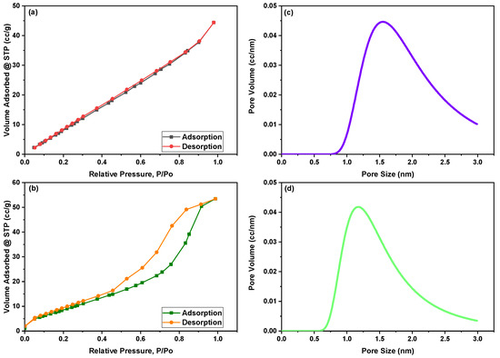 Figure 2a,b displays N2 adsorption–desorption isotherm curves of green synthesized CoFe2O4 nanoparticles and CoFe2O4/Ca-Alg nanocomposite as measured by the BET method, respectively. While Figure 2c,d shows the pore size distribution of both green synthesized CoFe2O4 nanoparticles and CoFe2O4/Ca-Alg nanocomposite, respectively. According to the IUPAC classification of adsorption isotherms, the isotherm curve of CoFe2O4 nanoparticles showed a typical type three (III) class, which does not have the “sharp knee” shape indicating that stronger adsorbate–adsorbate interactions than adsorbate–adsorbent interactions [46]. The green synthesized CoFe2O4 nanoparticles displayed an H3 hysteresis type, in which the pores have a wedge-shaped pore, according to de Boer’s classification of hysteresis loops [47]. The isotherm curve of CoFe2O4/Ca-Alg nanocomposite has exhibited type four (IV) of adsorption isotherm, which reveals non-porous or microporous adsorbents with unlimited monolayer–multilayer adsorption. In this isotherm, the adsorption volume quickly increases at low relative pressures due to contact of the adsorbate molecules with the higher energetic section followed by the interaction with the less energetic section. Following the completion of the monolayer formation of the adsorbed molecules, multilayer formation begins to occur in accordance with the “sharp knee” of the isotherm. In contrast, a sudden rise signal indicates the bulk condensation of adsorbate gas to liquid as the relative pressure approaches unity. Moreover, the synthesized CoFe2O4/Ca-Alg nanocomposite displayed an H2 hysteresis type, in which the pores have an inkbottle-shaped pore and are associated with capillary condensation phenomena in mesoporous structures. This hysteresis loops type indicates the presence of complex pore networks. A summary of area, volume, and pore size results is tabulated in Table 1.