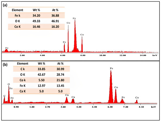 The elemental composition of green synthesized CoFe2O4 nanoparticles and CoFe2O4/Ca-Alg nanocomposite was presented in Figure 5a,b as well in the corresponding inset tables. It could be observed that the green synthesized CoFe2O4 nanoparticles and CoFe2O4/Ca-Alg nanocomposite samples mainly consist of the three elements (Fe, O, and Co) with wt% of 34.20%, 49.33%, and 16.46% showing an iron/cobalt ratio of 2.1/1 for CoFe2O4 nanoparticles, and five elements (C, O, Co, Fe, and Ca) with wt% of 33.85%, 42.67%, 5.50%, 12.97%, and 5.0% showing an iron/cobalt ratio of 2.4/1 for CoFe2O4/Ca-Alg nanocomposite, which represents the major structure of CoFe2O4 and CoFe2O4/Ca-Alg, respectively. Where the Fe, O, and Co elements refer to the CoFe2O4 compound, while the presence of C and Ca elements confirms the successive functionalization of CoFe2O4 by the alginate biopolymer. These results demonstrated the good formation of both green synthesized CoFe2O4 nanoparticles and CoFe2O4/Ca-Alg nanocomposite.