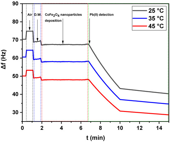 The net frequency shifts of the green synthesized CoFe2O4 nanoparticles-coated QCM nanosensor in Pb(II) aqueous solutions with different temperatures (25 °C, 35 °C, and 45 °C) as a function of time.