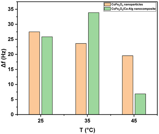 The net frequency shifts of the green synthesized CoFe2O4 nanoparticles and CoFe2O4/Ca-Alg nanocomposite-coated QCM nanosensors in Pb(II) aqueous solutions as a function of the solution temperature.