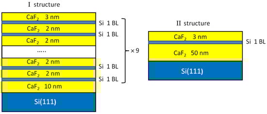 - Wang, C.R.; Muller, B.H.; Bugiel, E.; Hofmann, K.R. Surfactant enhanced growth of thin Si films on CaF2/Si(111). Appl. Surf. Sci. 2003, 211, 203. [Google Scholar] [CrossRef]