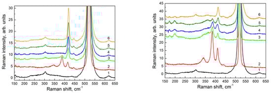 Raman spectra obtained for structures with different thicknesses of epitaxial films; left panel: 29 nm; right panel: 53 nm. Spectrum (1) corresponds to a Si(111) substrate, spectrum (2) corresponds to a film grown with simultaneous electron irradiation during deposition of CaF2. Other spectra correspond to regions of the films formed with postgrowth electron irradiation with different electron exposure times: (3) 10 min; (4) 4 min; (5) 2 min; (6) 1 min.