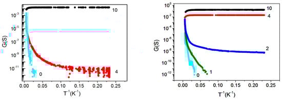 The conductance measurements of the films under study (Figure 6) were in good agreement with the SEM and EDX data. The conductance increased with the electron exposure time, with the temperature dependence of the conductivity changing from the semiconductor to the metal one. For the same electron irradiation time, the conductance of the thicker sample was always larger than that of the thinner one. Correspondingly, a 53 nm thick sample already exhibited a metallic behavior after a 4-min irradiation, while a 29 nm thick sample behaved like a semiconductor at this irradiation time.