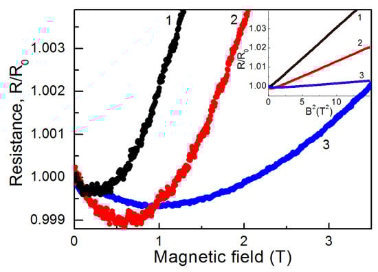 According to the Kohler rule [40], in this case, R(B)/R(B = 0) ∼ 1 + (μB)2. From the slope of R/R0(B2) dependence (inset to Figure 7), we could estimate the carrier mobility μ. For a 53 nm thick film, μ was found to be ~560 cm2 V−1 s−1 for the sample with a 10 min electron irradiation and ~380 cm2 V−1 s−1 for the sample with a 4 min electron irradiation, correspondingly. For a 29 nm thick sample irradiated for 10 min, μ~ 165 cm2 V−1 s−1.