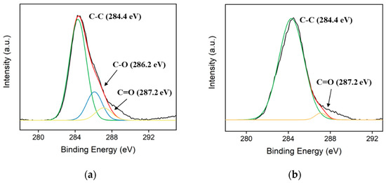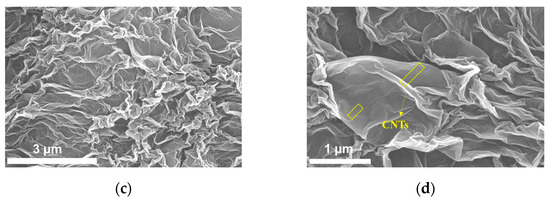 The process of reducing GO to ErGO was studied by XPS and the results are shown in Figure 1a,b. As demonstrated, the high-resolution C1s spectra of both GO and ErGO revealed three types of carbon bonds, including C–C/C=C (sp2 carbon, 284.4 eV), C–O (286.2 eV) and C=O (287.2 eV). When GO was electrochemically reduced to ErGO, the C-O peak could not be observed and the intensity of the C=O peak decreased, suggesting that the oxygen-containing functional groups of GO had been successfully reduced in the electrochemical process, and thus the graphene sheet had been reduced and removed. Figure 1c,d shows the SEM images of 3DG-CNT/GCE with different amplifications. As seen, there are many crumples perpendicularly aligned to the electrode’s surface in the 3DG-CNT, indicating the increased effective specific surface area of the electrode and the improved accessible mass transfer. In the high-resolution SEM image shown in Figure 1b, a small amount of CNT can be observed, showing the successful preparation of 3DG-CNT.