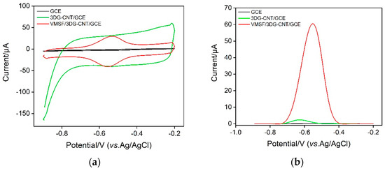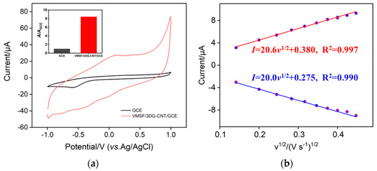 Figure 3a shows the CV curves of the bare GCE and the VMSF/3DG-CNT/GCE in 0.1 M PBS (pH = 6). The pair of redox peaks around 0 V is due to the electrochemical reaction between the quinone and hydroxyquinone moieties in the 3DG-CNT. The cathodic current peak displayed at around –0.5 V is ascribed to the reduction of oxygen (Figure S1). As a comparison, the surface area of the VMSF/3DG-CNT/GCE is about 8.5 times larger than that of bare GCE, which is due to the formation of the 3D network structure of the 3DG-CNT nanocomposite. The effective surface area of bare GCE was calculated to be 0.0935 cm2, according to the data shown in Figure 3b and Equation (1). Thus, the effective surface area of the VMSF/3DG-CNT/GCE was about 0.790 cm2.