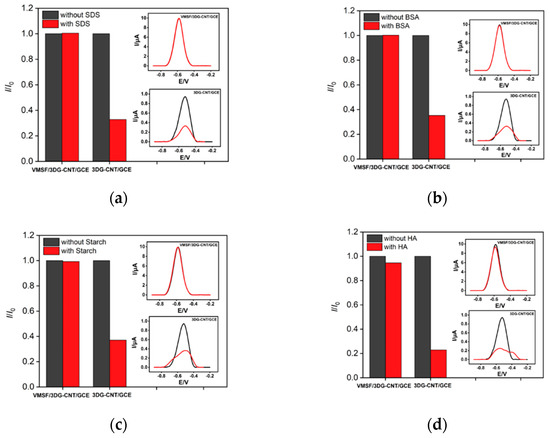 The anti-fouling ability of the VMSF/3DG-CNT/GCE is very important for the analysis of real samples. Surfactants (sodium dodecyl sulfate, SDS), protein (bovine serum albumin, BSA), polysaccharide (starch) and macromolecular substances (humic acid, HA) commonly exist in complex samples and may produce severe surface fouling of an electrode. These were used to verify the anti-fouling ability of the VMSF/3DG-CNT/GCE. We compared the anodic peak currents of PQ on the VMSF/3DG-CNT/GCE and 3DG-CNT/GCE with (I) and without (I0) fouling substances. As exhibited in Figure 6, the presence of fouling substances could generate surface fouling of the 3DG-CNT/GCE and passivate the sensor, leading to remarkably decreased peak currents (only 20~40% of the initial values) and much wider current peaks. However, 95% of the initial values still remained for the VMSF/3DG-CNT/GCE, indicating the excellent anti-fouling capacity of the VMSF/3DG-CNT/GCE and the great potential for the detection of PQ in complex samples.