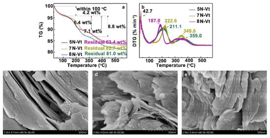 The morphology of Na-Vt is presented as a typical flat surface with small fragments stacking irregularly (Figure S3). After organic modification, the surface of organo-Vts becomes fluffy and curled (Figure 3c–e), indicating the coverage effect of surfactants on the surface of Na-Vt. Both 5N-Vt and 8N-Vt retain the lamellar structure and stacking layers of the raw Na-Vt, which may be due to the modifiers being mainly adsorbed on the surface of Na-Vt, without destroying the lamellar structures. In the case of 5N-Vt, on the other hand, the layers stack irregularly and loosely, proving the more preferable adsorption trend of 7N in the interlayer space of Na-Vt.