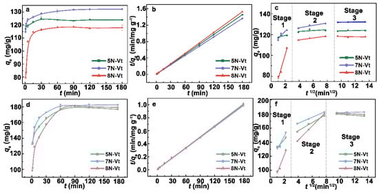 The effects of the time and adsorption kinetics of 2-NP and BPB are shown in Figure 5. Organo-Vts show a rapid adsorption rate toward 2-NP, with the equilibrium time reaching approximately 30 min. In the adsorption process of BPB, a slow adsorption equilibrium is obtained within 60 min. To clarify the adsorption kinetics, pseudo-first order (PFO), pseudo-second-order (PSO) and intraparticle diffusion (IPD) models are applied to fit the adsorption data (Table 2) [24]. Compared with PFO, PSO models are more suitable to the equilibrium data, with a higher R2 and better consistency of qe,cal to qe,exp, indicating that the adsorption processes are mainly chemically controlled. The smaller values of k2qe (second-order rate index, indicating the inverse of the half-life of adsorption process) are in line with the faster adsorption rate [25]. Moreover, 8N-Vt owns the highest adsorption rate toward both 2-NP and BPB, indicating the greater affinity of the aza-group to organic pollutants than the alkyl chain. Notably, the uptake rate of BPB for 5N-Vt is higher than 7N-Vt, which may be due to the depressed effect of the steric hindrance of BPB on the adsorption rate.