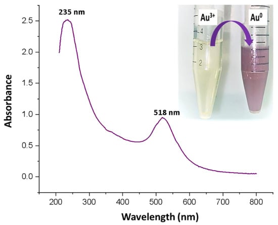 UV–vis spectroscopy scan of the cefoxitin-synthesized gold nanoparticles. (Inset) Physical observation of the change in color from yellow to ruby red.