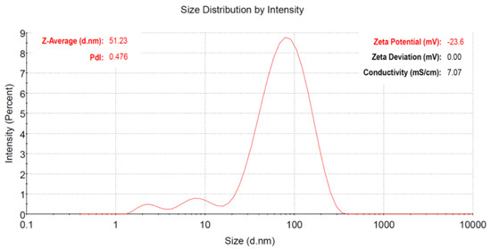 To determine the size distribution of the cefoxitin-synthesized gold nanoparticles in the dispersion, the dynamic light scattering (DLS) technique was used. In fact, during DLS analysis, the arbitrary variations in the light intensity scattered by the dispersion of nanoparticles are used to estimate the size [37]. The Z-average mean size was estimated as 51 nm for the cefoxitin-synthesized gold nanoparticles in the present study (Figure 3). On the other hand, zeta potential was used to assess the surface charge on gold nanoparticles, which showed their colloidal dispersion stability [38]. It was actually dependent on the level of electrostatic repulsion within the similarly charged particles in the dispersion. In the current study, the zeta potential value of cefoxitin-synthesized gold nanoparticles was calculated as −23.6 mV (Figure 3 inset). It has been reported that particles with higher +ve or −ve zeta potential (>±20 mV) repel each other, and will not be aggregated easily [39]. Hence, the cefoxitin-synthesized gold nanoparticles of the present study were found to be stable. However, the high negative charge might be attributed to the presence of functional groups in the cefoxitin antibiotic loaded on the surfaces of the gold nanoparticles.