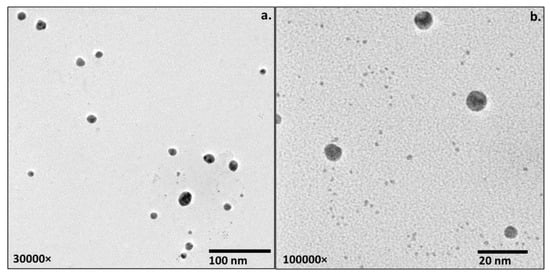 Transmission electron microscopy (TEM) was used to depict the size of the inorganic core of the cefoxitin–gold nanoparticles. Two different magnifications were used for TEM imaging: 30,000× (Figure 4a) and 1,000,000× (Figure 4b). TEM images for cefoxitin–gold nanoparticles revealed that the cefoxitin–gold nanoparticles were poly-dispersed, with a size of 2–12 nm. No aggregation was observed in the TEM images, which corresponds to effective capping/stabilization via cefoxitin. Size differences in the cefoxitin–gold nanoparticles evaluated by DLS (51 nm) and TEM (2–12 nm) could be observed in this study that might be due to the different principles of size calculation. TEM sizing is based on transmission electrons and provides information of the inorganic core, whereas DLS estimates the size of nanoparticles in a hydration state, which includes the information of the solvent layer adhered to them in the liquid medium [,,,,]. Thus, the size estimation by DLS is relatively higher than that by TEM. This aspect of the size measurement of gold nanoparticles has been reported in several previous investigations as well [,,,].