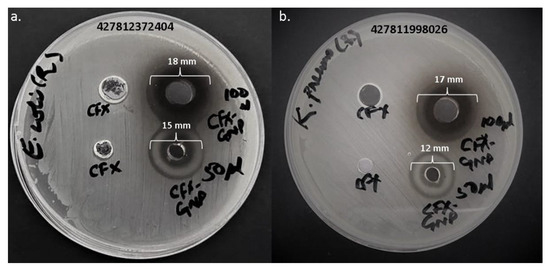 Antibacterial activity of cefoxitin (CFX) and cefoxitin–gold nanoparticles (CFX-GNP) against (a) Escherichia coli and (b) Klebsiella pneumoniae.