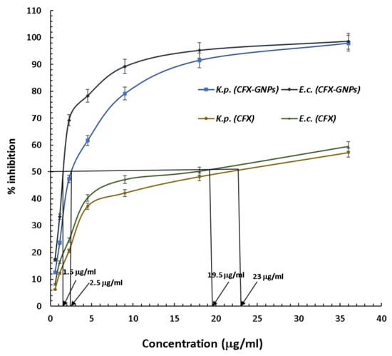 It is noteworthy to mention that cefoxitin (a second-generation cephalosporin) was once considered as an alternative if the bacterial strain developed resistance towards other second-generation cephalosporins, due to its resistance towards β-lactamase/cephalosporinase []. However, past reports suggested that bacterial strains have gained resistance towards cefoxitin as well by alternate mechanisms [,,,,]. It has been reported that cefoxitin resistance in K. pneumoniae and E. coli is linked with porins or non-specific outer-membrane proteins ompK35 and ompK36 [,]. In fact, porins are water-filled channels that allow the diffusion of the β-lactam antibiotic via the outer membrane. However, cefoxitin (β-lactam antibiotic) resistance is due to the loss or modification of these porin channels []. Gold nanoparticles have the capability to form pores in the outer membranes of Gram-negative bacterial strains and cause cell membrane disruption [,,]. Hence, they can deliver the antibiotic attached to them in a more efficient manner, even though the porins are lost or modified. The current study showed that cefoxitin resistance was overcome after loading onto gold nanoparticles. These results are supported by other studies conducted on third-generation cephalosporins (cefotaxime and ceftriaxone) in the recent past [,]. They used different Gram-positive and Gram-negative strains of non-clinical origin to test the antibacterial efficacy [,]. However, the current study used a second-generation cephalosporin against the clinical uro-pathogenic resistant strains of K. pneumoniae and E. coli. An additional benefit of gold nanoparticles as an antibiotic carrier is that they offer a large surface area to deliver a good amount of antibiotic to the bacterial cell. Therefore, it is anticipated that the gold nanoparticles might have delivered a larger cefoxitin quantity to the tested strains in comparison to cefoxitin alone. The gold nanoparticle itself is capable of interacting with the biomolecules of bacterial cells, and causes substantial damage to the cell. Thus, cefoxitin’s successful delivery might have provided a synergistic attack on the bacterial cell. Further, the minimum inhibitory concentration (MIC50) was calculated for cefoxitin–gold nanoparticles against K. pneumoniae and E. coli. The MIC50 for cefoxitin–gold nanoparticles was estimated as 1.5 μg/mL against E. coli and 2.5 μg/mL against K. pneumoniae (Figure 6). On the other hand, cefoxitin alone showed an MIC50 of 19.5 μg/mL and 23 μg/mL against E. coli and K. pneumoniae, respectively. All these results evidently prove that nanotechnology could augment the potency of cefoxitin via loading onto gold nanoparticles. Importantly, an easy one-pot synthesis approach was applied in the present study (without the use of any external chemical reducing/capping agent) to produce effective cefoxitin–gold nanoparticles. Conclusively, it can be proposed that gold nanoparticles, as a cefoxitin carrier, might be applied in the future to overcome/reduce the probability of cefoxitin resistance.