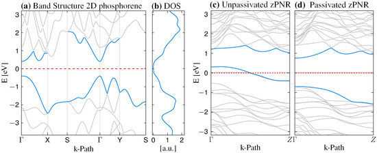 We start our analysis by calibrating the DFT calculations on the pristine 2D phosphorene and freestanding zPNRs. In this way, we recover some of the previously reported behaviors. The electronic properties are illustrated in Figure 2, which shows band structures for both types of systems. In Figure 2a, the band structure for bulk 2D phosphorene is depicted along a representative k-path, evidencing the direct band gap of ∼0.82 eV, found at the point. Even though the band gap is underestimated compared to the experimental value, this is expected within the LDA approximation, as for earlier GGA-based calculations [23]. The corresponding density of the states associated to the pristine 2D phosphorene is displayed in Figure 2b. Concerning the nanoribbon systems, the band structures of zPNRs with and without hydrogen passivation are illustrated in Figure 2c,d, respectively. The passivated structure exhibits a semiconductor-like behavior, with a band gap around 1.42 eV, larger than the 2D monolayer due to quantum confinement effects. However, if the passivation is removed, a metallic-like character is obtained, with two bands crossing the Fermi level. These results are consistent with other reports on the electronic structure of PNRs [24], and different passivating species can further modify the energy gap.